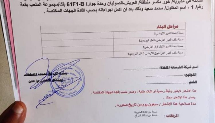 وقالت المصادر مطلعة إن الوزير الزعوري بدأ ببناء الفلة على قطعة الأرض البالغ مساحتها نحو 900 متر مربع في منطقة العريش بمديرية خورمكسر.