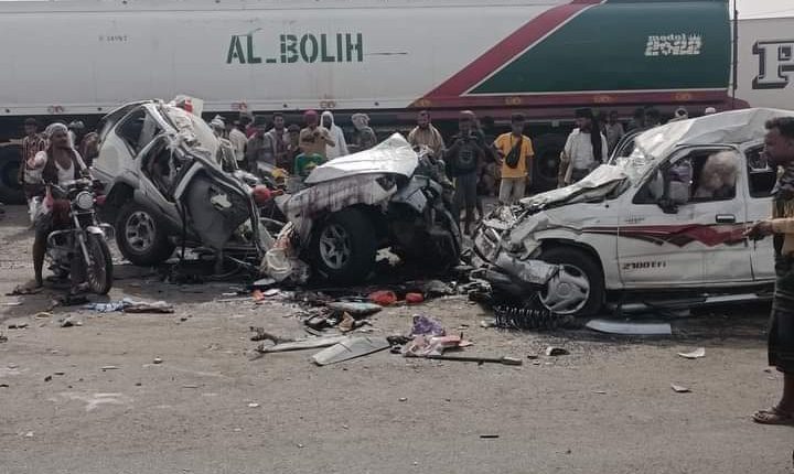 قُتل ثلاثة مسافرين وأصيب خمسة آخرين، في حادث مروري مروع شهده الطريق الواصل بين محافظتي لحج وعدن، اليوم السبت.