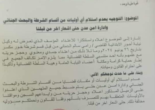 ووفقاً للتوجيه ، شدد القاضي وضاح عبدالله باذيب، رئيس نيابة استئناف جنوب عدن، على “عدم استلام أي أوليات أو ملفات قضايا من أقسام الشرطة والبحث الجنائي وإدارة أمن عدن؛ حتى يتم ضبط جميع المتهمين الذين اعتدوا على الزميل (القاضي الدماني)”.