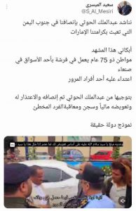 ونشر الناشط الجنوبي سعيد الميسري مناشدة لزعيم أنصار الله إنصاف الجنوبيين من الظلم الذي يتعرض له أبناء الجنوب من قبل القوات التابعة للإمارات، بعد أن رأى كيف تم إنصاف صاحب البسطة، مشيراً في تغريدة على حسابه بمنصة إكس إن مشهد الاعتذار لصاحب البسطة من قبل قيادات وزارة الداخلية وتعويضه أدمع عينيه من شدة الموقف وشعور الفرحة بإنصاف المظلوم وتعويضه.