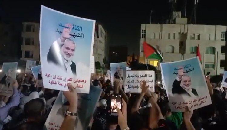 شهدت العاصمة الأردنية عمّان، مساء الأربعاء، تظاهرات شعبية غاضبة حيث احتشد الآلاف من الأردنيين بالقرب من السفارة الإسرائيلية تعبيراً عن استنكارهم لاغتيال هنية. وهتف المحتجون بشعارات منددة بسياسات الاحتلال الإسرائيلي وداعمة للمقاومة الفلسطينية، مطالبين بطرد السفير الإسرائيلي وإغلاق السفارة.