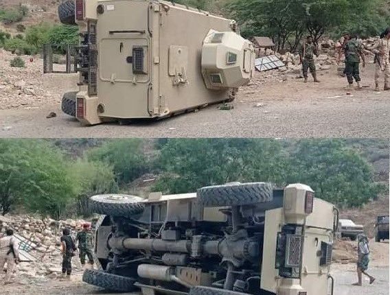 انقلاب مدرعة سعودية مرافقة للعليمي بتعز وإصابة جنديين سعوديين من مرافقيه