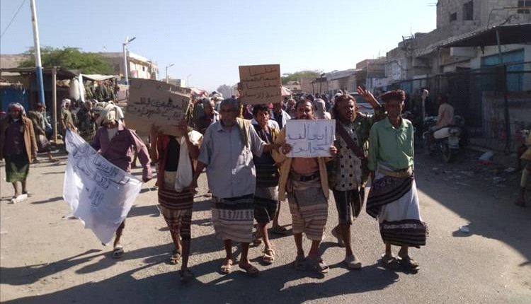 وتجمع المجتجون في الشارع العام بمدينة المحفد، رافعين شعارات معبرة عن مطالبهم، ومرددين هتافات عدة منددة بانهيار الريال اليمني والذي وصل إلى أدنى مستوى له على الإطلاق.