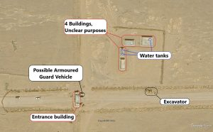 كما أظهرت الصور مهبطا للطائرات غير مكتمل وأبراج للمراقبة على طول محيط الساتر الرملي، وبعض مجموعات المباني وعربة عسكرية لحراسة الاستحداثات الإماراتية بالجزيرة.