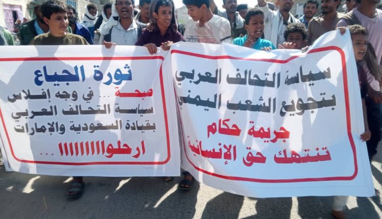 خرج العديد من المواطنين في مديريات الوضيع، مودية، والمحفد، في مسيرات غاضبة عبروا خلالها عن رفضهم لسياسة التجويع الممنهجة التي يمارسها التحالف بحق أبناء أبين والمناطق الجنوبية. ورفع المحتجون شعارات تطالب برحيل التحالف وإنهاء معاناة الشعب، الذي يعاني من انقطاع المرتبات وارتفاع جنوني في أسعار السلع الغذائية بسبب الانهيار الكارثي للريال اليمني أمام العملات الأجنبية.