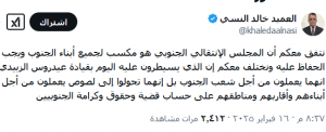 وجه الخبير العسكري الجنوبي خالد النسي انتقادات حادة لقيادات المجلس الانتقالي المدعوم من الإمارات، واصفاً إياهم بـ”اللصوص”. وفي منشور على منصة “إكس”، اتهم النسي قيادات المجلس، بقيادة عيدروس الزبيدي المقيم في الإمارات، بالتركيز على تحقيق مصالح شخصية وعائلية ومناطقية بدلاً من خدمة المواطنين.