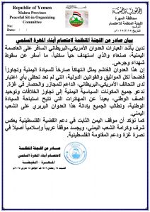 ودعت اللجنة جميع الأطراف المحلية والدولية إلى إدانة هذا العدوان البربري على الشعب اليمني، مؤكدة أن استمرار مثل هذه الاعتداءات لن يزيد اليمنيين إلا إصراراً على الدفاع عن سيادتهم ودعم قضاياهم العادلة.