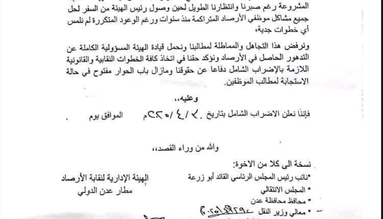 وأشار البيان إلى أن الإضراب الشامل يشمل جميع أقسام الأرصاد الجوية في المطار، محذراً من تداعيات ذلك على حركة الملاحة الجوية إذا لم تتحرك الجهات المعنية لمعالجة المطالب.
