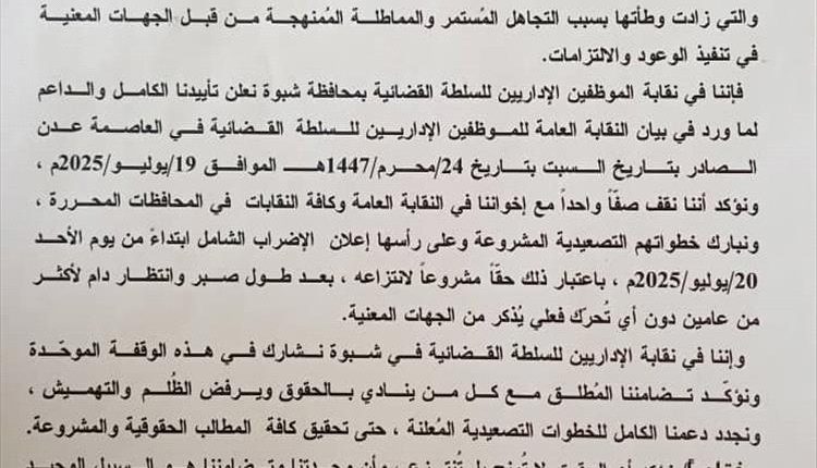نقابة موظفي السلطة القضائية في شبوة تُعلن تضامنها مع إضراب عدن وتُحذّر من امتداده إلى أبين