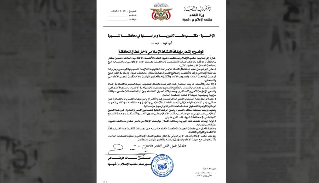 أصدرت السلطة المحلية في شبوة، بتوجيهات مباشرة من المحافظ عوض بن الوزير العولقي، قراراً بإيقاف عمل قناة “المهرية” المحسوبة على حزب الإصلاح، في خطوة تعيد إشعال جبهة التضييق على إعلام الحزب تحت يافطة مكافحة “الإخوان المسلمين”.