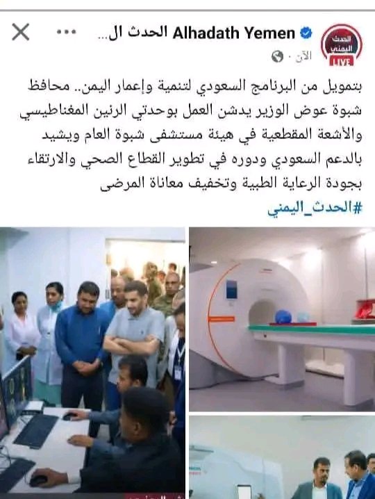 كشفت مصادر ميدانية في محافظة شبوة عن فضيحة جديدة تتمثل في محاولة قناة “الحدث” واللجنة الخاصة الموالية للسعودية، نسب أجهزة طبية وأشعة رنين مغناطيسي إلى ما يُسمى “البرنامج السعودي لإعادة إعمار اليمن”.