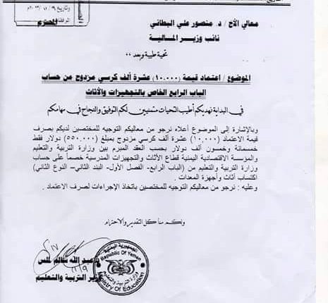 وأشارت وثائق أخرى إلى قيام وزير التربية والتعليم بتوجيه مذكرة لنائب وزير المالية صادرة بتاريخ 9/11/2017م طالبه فيها باعتماد قيمة (10) ألف كرسي فقط من حساب الباب الرابع الخاص بالتجهيزات المدرسية، كي يتم مصادرة قيمة الـ (20) ألف كرسي المتبقية حسب الاتفاقية.